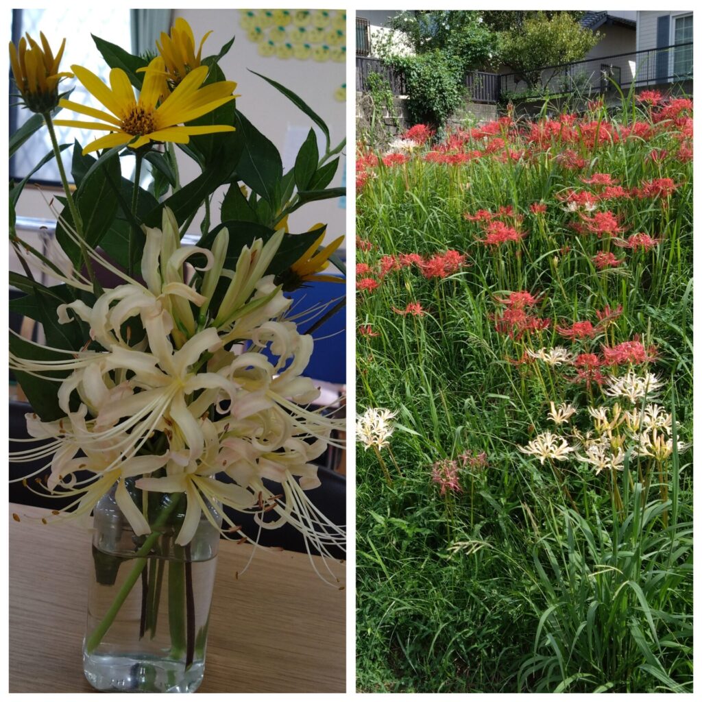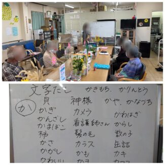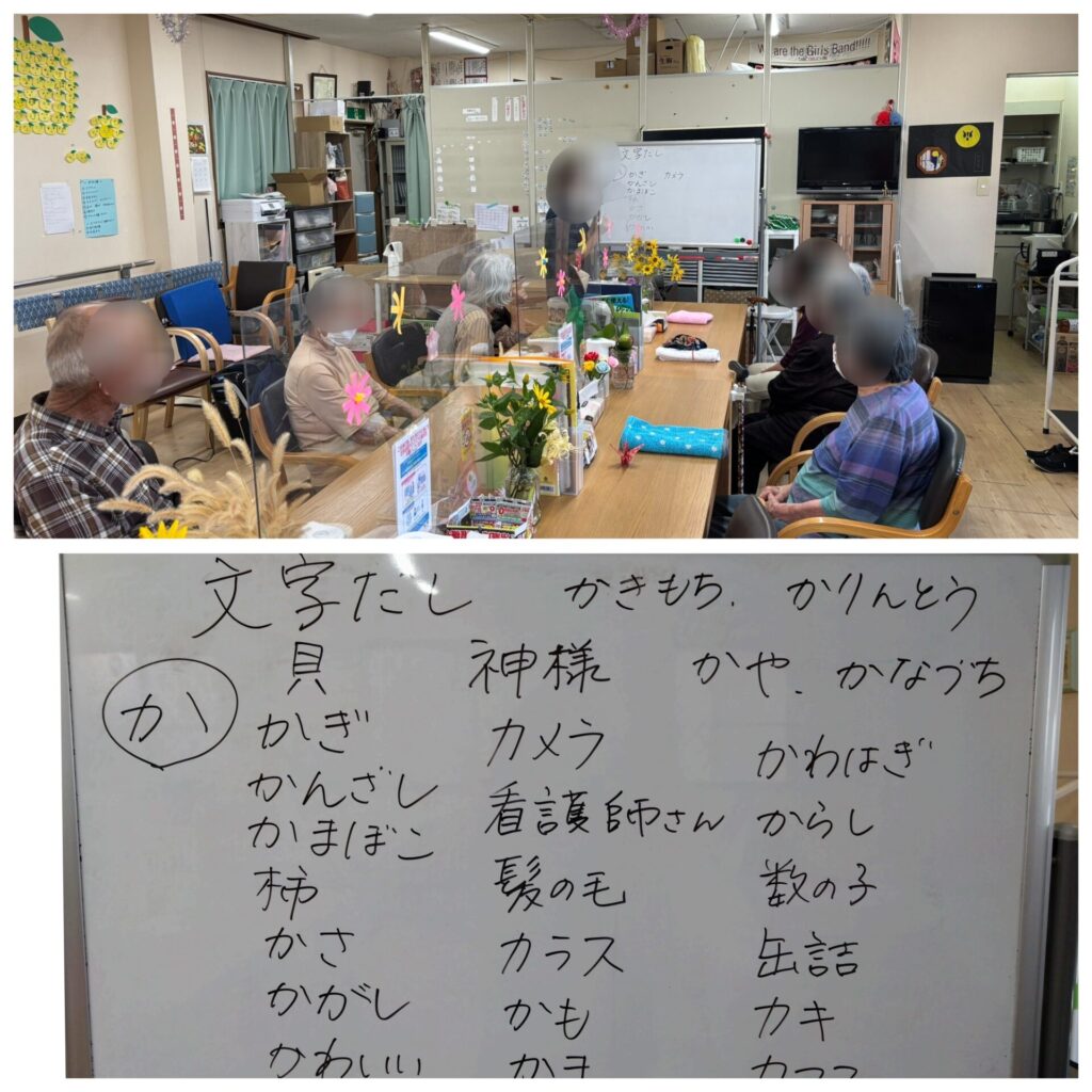 こんにちは。まだまだ日中暑い日が続いていますが、9月も下旬になり、朝・晩は過ごしやすくなりましたね。彼岸花も咲き、秋の気配を感じられます。 今週の脳トレは「か」から始まる文字だしを行いました。「すぐには出てこないね」と言われながらも、たくさん出していただきました。最後には、「まだ沢山あるよね」と終わってからも考えられてました😊