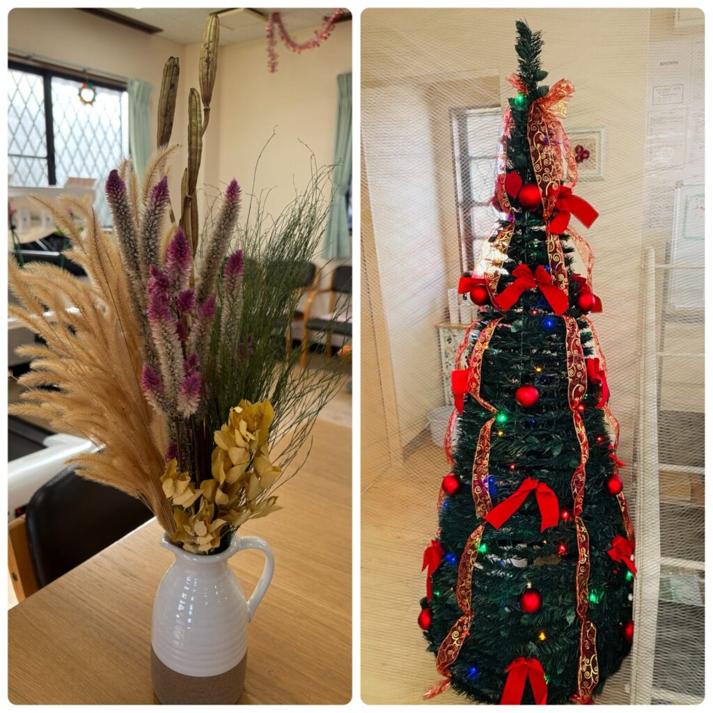 こんにちは。秋も深まり紅葉が🍁あちこちで見頃を迎えています。日本には四季がありますが最近は二季(夏冬)になりつつあるとニュースで観ました。食欲の秋、読書の秋などありますが、もう少し秋を堪能できるといいですね♪ 先日、利用者様がご自分で作られたとても素敵なドライフラワーを持って来てくださいました💐12月も近くなりクリスマスツリー🎄も飾りました。最近の脳トレでは身近にある電化製品を出していただきました。生活になくてはならない物がたくさんありますね😊